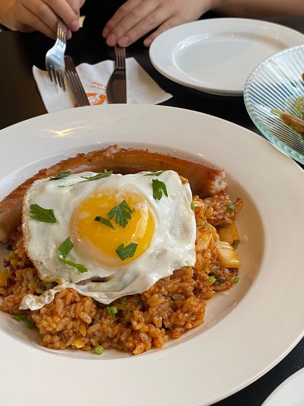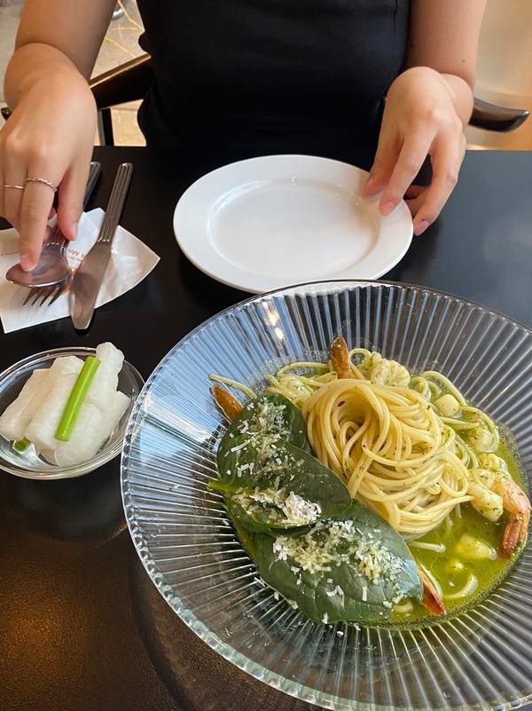 시금치 오일 파스타와 김치 라구 볶음밥은 가격이 10,000원 초중반대로 주변 가게보단 가격이 착해 부담이 덜 하다. 시금치 오일 파스타는 시금치를 선호하지 않는 사람도 충분히 즐길 수 있는 맛이다. 시금치의 맛이 강하지 않고 지금까지 먹어봤던 오일 파스타 중 가장 만족한 파스타이다. 오일이 듬뿍 들어간 촉촉한 오일 파스타지만 너무 기름지지도 않고 뻑뻑한 식감도 아니어서 식감, 맛 둘 다 잡은 음식이다. 새우도 큼지막하게 들어있어 음식이 단조롭지 않아서 좋았다.